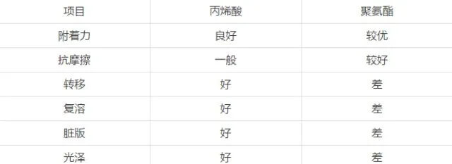 這兩類常見的水墨中,以丙烯酸類水墨的生產(chǎn)應(yīng)用占明顯優(yōu)勢,丙烯酸類水墨與聚氨酯類水性的比較基本情況見下表: