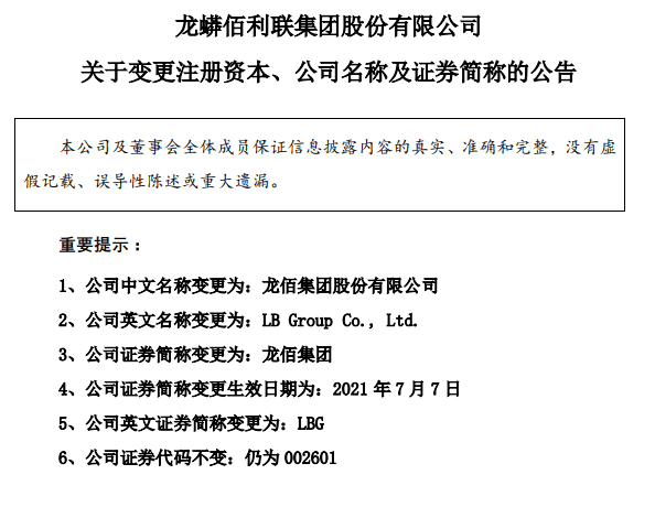 龍蟒佰利全稱龍蟒佰聯(lián)集團(tuán)有限公司,更名為龍佰集團(tuán)股份有限公司(英文名稱:LB Group Co ltd)于2021年7月6日完成工商變更登記手續(xù),注冊(cè)資本由之前的2,032,020,889元變更為2,239,610,256元,由焦作市市場(chǎng)監(jiān)督管理局核發(fā)營(yíng)業(yè)執(zhí)照。自2021年7月7日起,經(jīng)深圳證券交易所審核批準(zhǔn),公司證券簡(jiǎn)稱由“龍蟒佰利”變更為“龍佰集團(tuán)”,公司英文證券簡(jiǎn)稱由“LMBL”變更為“LBG”,公司證券代碼不變,仍為“002601”。