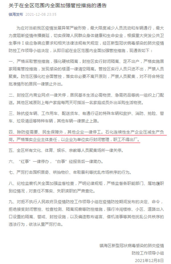 寧波鎮(zhèn)海決定在全區(qū)范圍內(nèi)全面升級(jí)管控措施,除防疫需要、民生保障外,其他企業(yè)一律停工,石化連續(xù)性生產(chǎn)企業(yè)壓減生產(chǎn)負(fù)荷。嚴(yán)格落實(shí)企業(yè)主體責(zé)任,以企業(yè)為單位實(shí)行封閉管理,職工不得出廠。